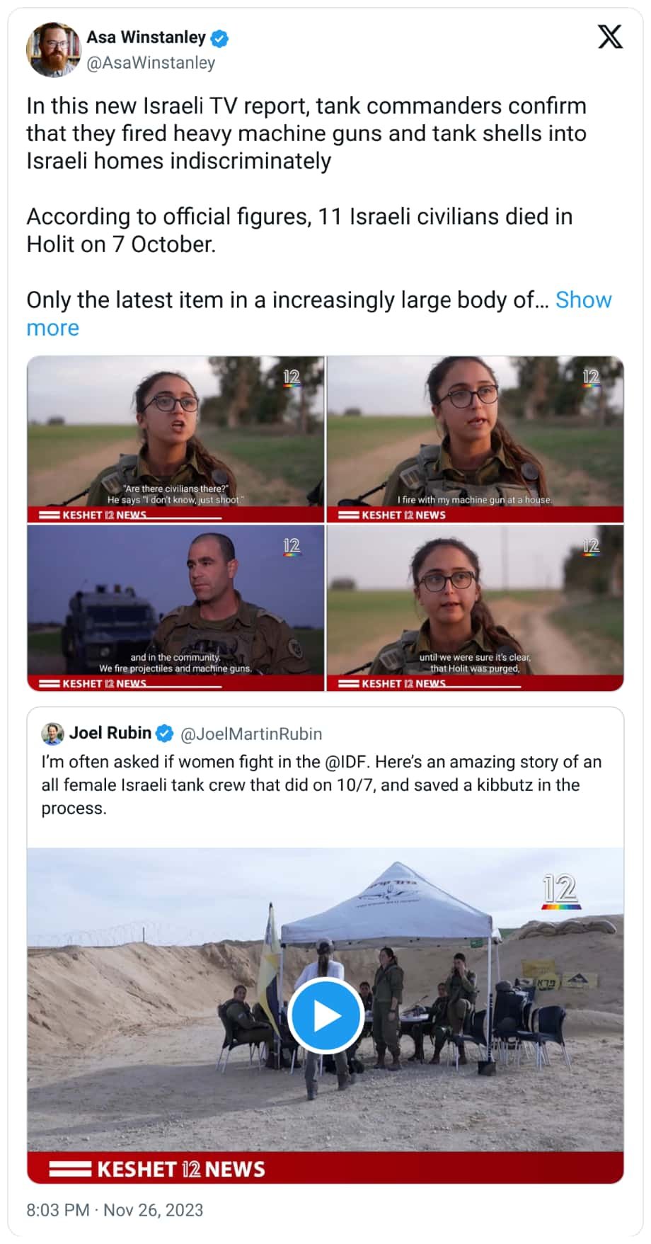 « Nous sommes entrés dans la communauté et avons défoncé la porte », a déclaré l’une des soldates à la chaîne israélienne Channel 12. « Le soldat montre du doigt et me dit “tirez là, les terroristes sont là”. Je lui demande, “Y a-t-il des civils là-bas ?”. Il me répond, “Je ne sais pas, tirez”. »