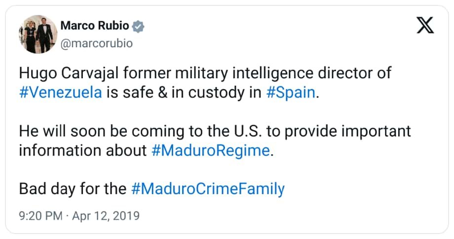 Le sénateur de l’époque, Marco Rubio, peinait à contenir son enthousiasme à l’idée de soutirer à un proche du chavisme un témoignage pour un futur dossier contre Maduro. Carvajal « arrivera bientôt aux États-Unis pour fournir des informations importantes sur le #MaduroRegime », a tweeté Rubio le 12 avril 2019. « Mauvaise journée pour la #MaduroCrimeFamily. »